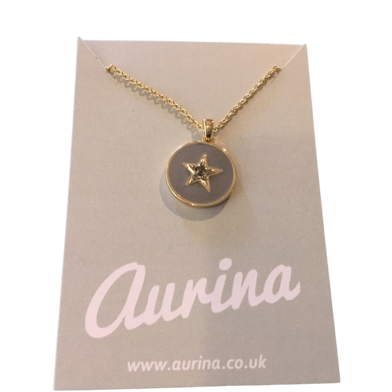 • Beautiful grey circular pendent with a gold sparkling star in the middle.