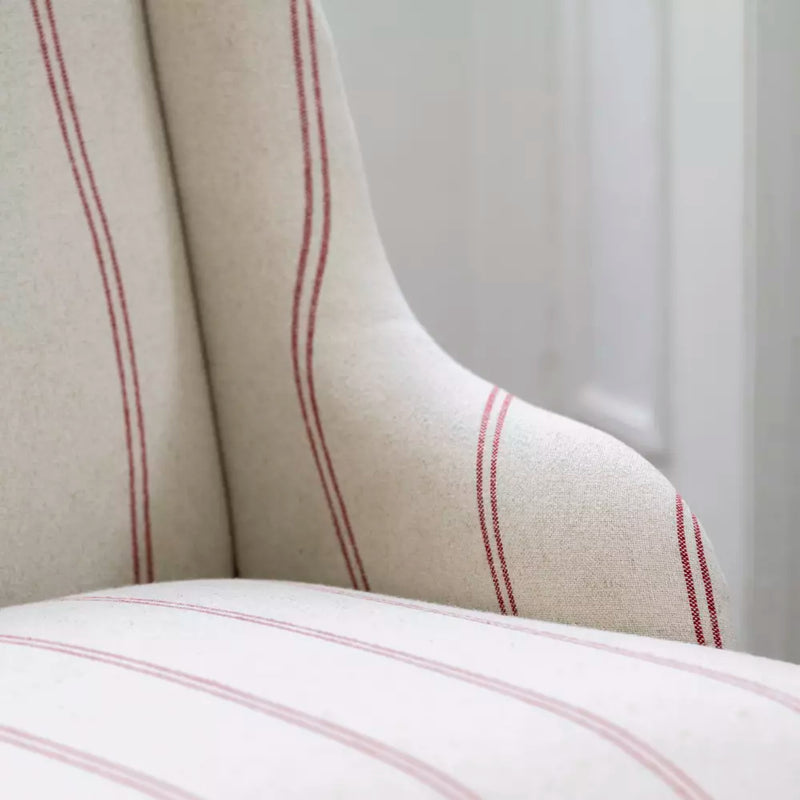 Pile with cushions and adorn your living space with our beautiful Margot Holt Stipe Chair. Crafted with a linen mix fabric in elegant neutral tones with red stripes this comfortable yet stylish piece of furniture would look delightful placed in a cosy corner, next to a roaring fire and draped with a snuggly throw.