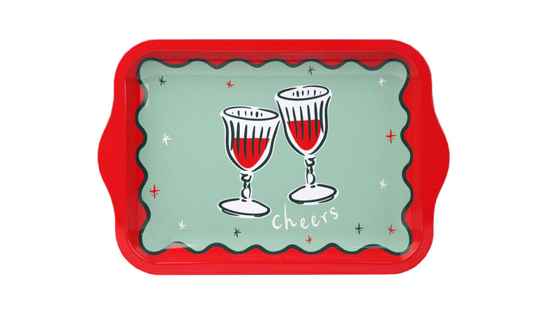 Raise a smile with the Small Tin drinks Tray – a compact, vintage-inspired piece designed for hosting. Made from reusable and recyclable tin, the design is printed directly onto the metal for bold, opaque colour and long-lasting quality. Featuring two clinking glasses and a playful hand-lettered ‘Cheers’ motif, it’s a nod to celebration and togetherness. Lightweight yet sturdy, it’s ideal for serving drinks or nibbles, and is equally effective as a decorative accent on a shelf, bar cart or counter.
