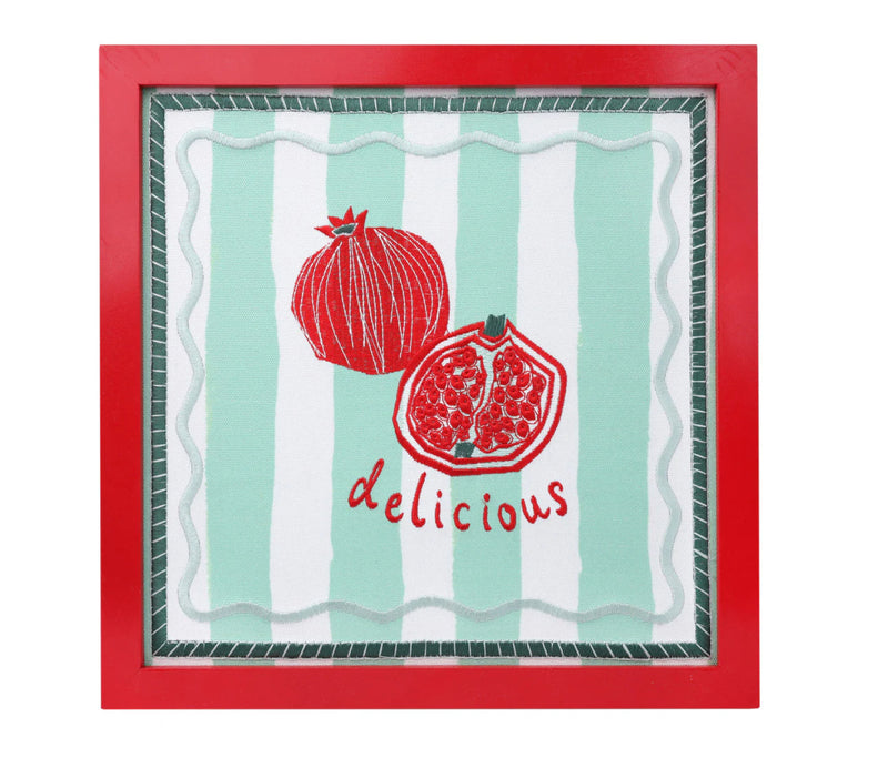 Add warmth and handmade charm to your wall with Pomegranate Fabric Framed picture. Made in India, it combines traditional embroidery techniques with a contemporary design palette. The hand-guided embroidered pomegranate and friendly ‘delicious’ sentiment sit on a green and white striped cotton base, framed in FSC®-certified wood that’s hand-painted in vibrant red. Each piece is hand assembled, finished, and comes individually boxed - ready to hang or gift. A sophisticated yet playful addition to kitchen décor.